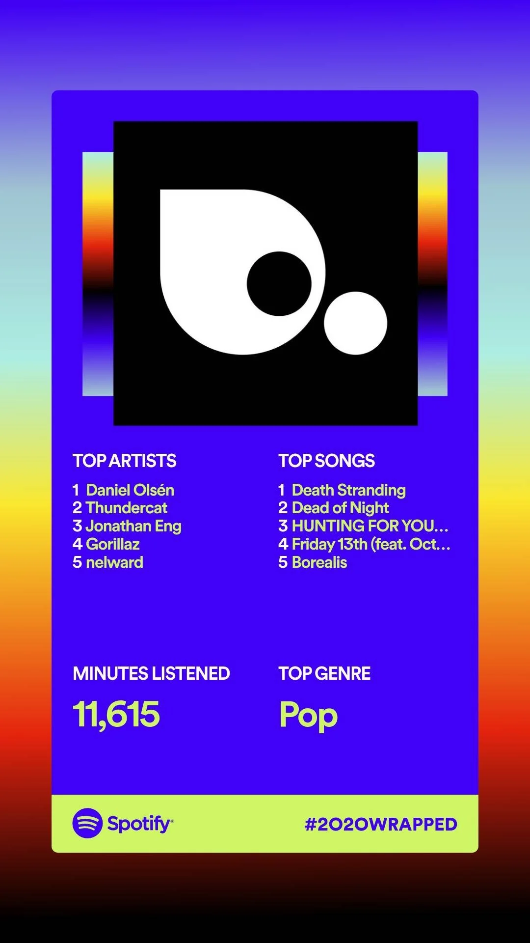Some may view something like this as trivial or just a fun thing to post each year, but others might find incredibly insightful. Looking at my own, I see some surprises among the expected. I must have really had a moment with CHVRCHES’ “Death Stranding,” and it reminds me how much I was thinking of Death Stranding the video game at the beginning of 2020. The song itself, which I’d recommend a listen to regardless of if you know its source material, takes on a prophetic new meaning in our COVID world than it did when I was listening in January and February. In that way, that song now in retrospect is also an unexpected and somber reminder to me of the world we had just 10 months ago at time of writing. I much expected Gorillaz to be higher on my list in both Top Artist and Top Songs category, as I lived for the release of each new Song Machine EP release throughout the year. “Song Machine Episode 3” was my favorite, with primary song “Aries (feat. Peter Hook and Georgia)” being a particular obsession.